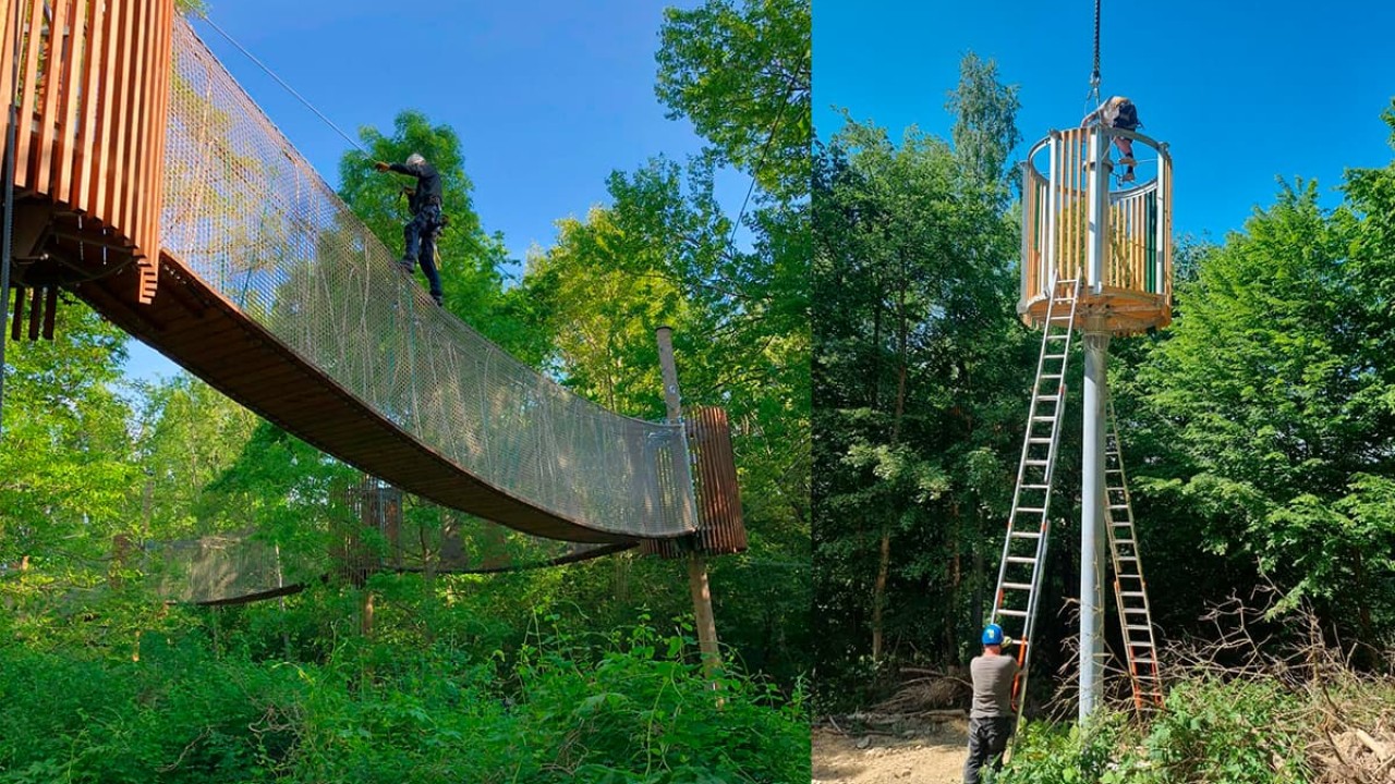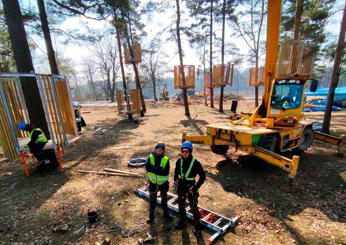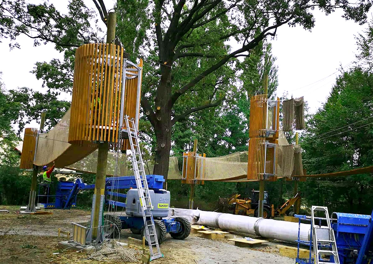 To etap, gdzie nasze ekipy montażowe zaczynają budować park linowy. Wszystkie pracujące u nas osoby posiadają odpowiednie kwalifikacje i doświadczenie niezbędne przy realizacji tak specjalistycznych obiektów często w bardzo trudnych warunkach. Wszystkie użyte materiały posiadają certyfikaty, deklaracje zgodności załączane do dokumentacji odbiorowej obiektu. W trakcie budowy wykonujemy również wiele testów i pomiarów tak aby zoptymalizować końcowy efekt.